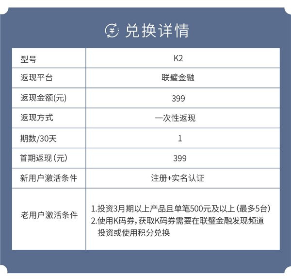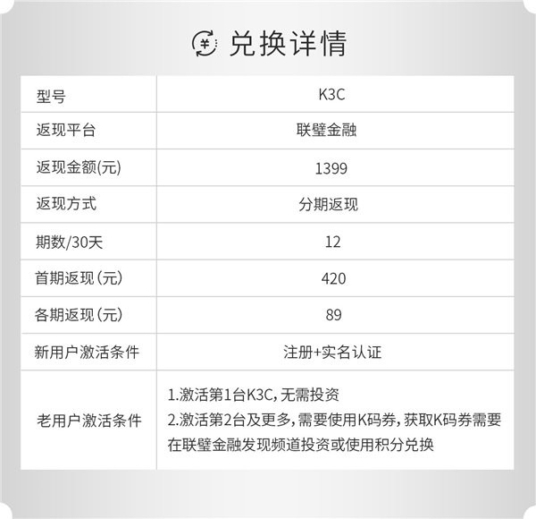 "0"元购流程:下单购买,收货激活K码,一个月后全额返现399元,最高实赚45元+K2路由器1台。