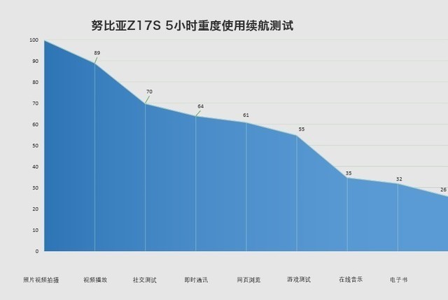 因为双面玻璃工艺的加入,努比亚Z17S的手机续航能力并不算十分突出,这也是大多数玻璃机身手机的通病之一。五小时重度续航测试之后努比亚Z17S的剩余电量在26%左右,中度或轻度使用一天一充甚至两天一充应该都是毫无压力的。