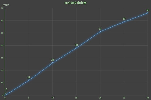 在充电上,努比亚Z17S使用了自家独创的NeoCharge 2.5充电技术,标配充电头的5V 最高充电功率达到了26W。根据笔者实测将手机电量耗尽,从0%开始充电,每5分钟记录一次电量,共计时30分钟,手机电量充到66%,速度表现极优。
