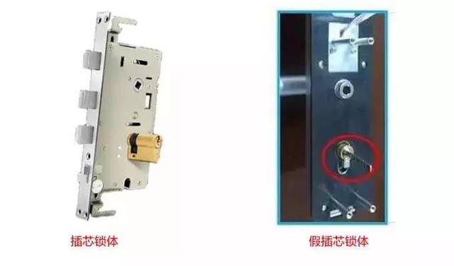 而没有这个结构的锁就被称为“假插芯”,锁孔大都位于外壳体底面,锁芯整体位于外壳内,以电子或机械结构与锁体相连。