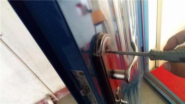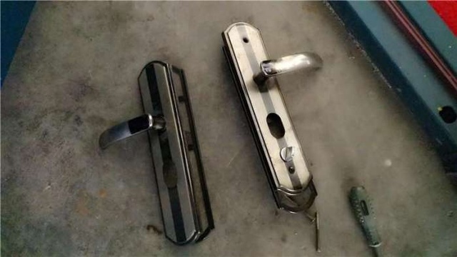 拆旧锁的速度很快的,螺丝拧开,两边的把手拿下来,在把锁体拿出来,搞定,顺便把天地锁也拆掉了。
