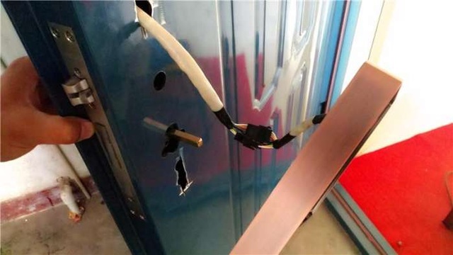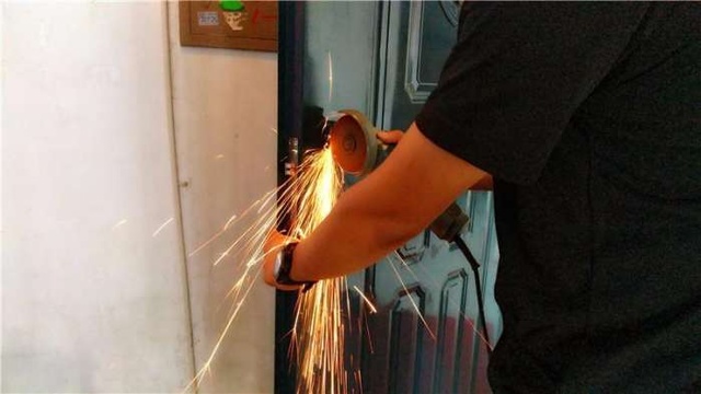 拆卸完毕,开始比对下,发现原来的防盗门安装的门锁的孔都比较小,插不进入,好办,开磨,拿起角磨机就开始干。不过的切割的时候要注意别把孔切大了,新锁体盖不住那这门可就废了。