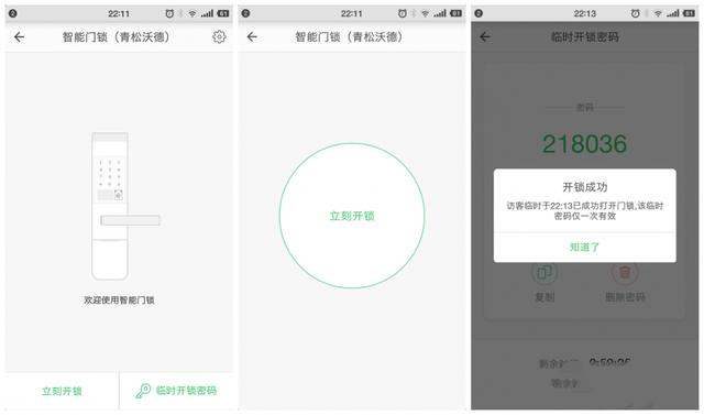 要是有亲朋好友到访,而恰好又没有人在家的话,我们就可以通过APP进行远程解锁。解锁方式有两种:立即开锁和临时密码。只需要手机一点,就可以直接开锁,也可以发送密码给朋友,让朋友自己开锁,但是临时密码只能用一次便马上失效。