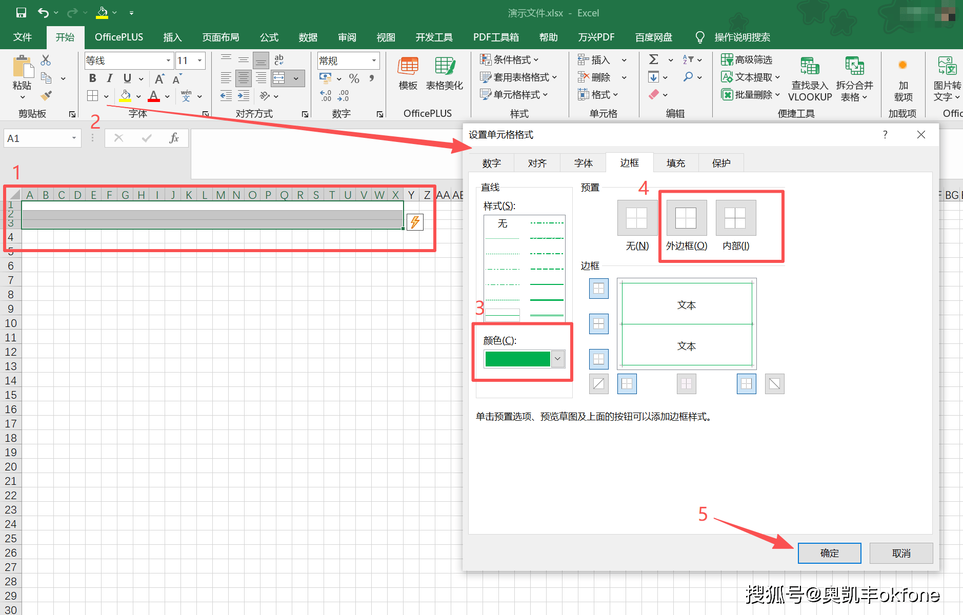 第五步:选中刚刚设置过的三行单元格,点击【边框】-【其它边框】,将颜色选为绿色,勾选【外边框、内部】,点击【确定】即可。