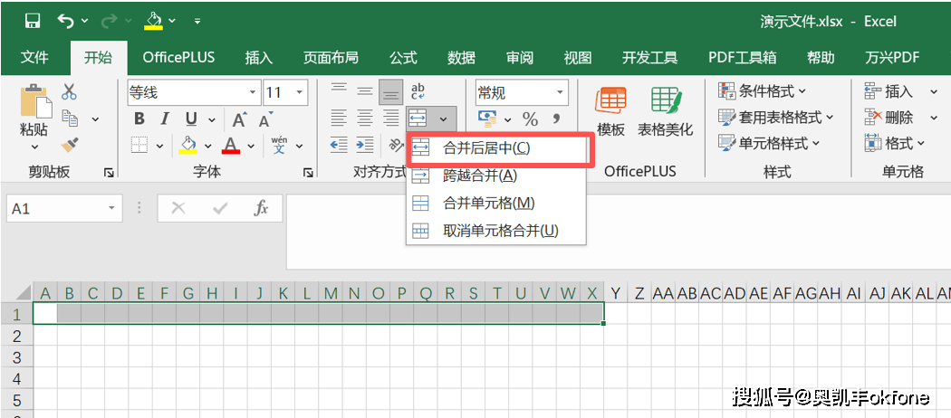 第三步:选中第一行的单元格,设置【合并后居中】,下拉填充到第三行。