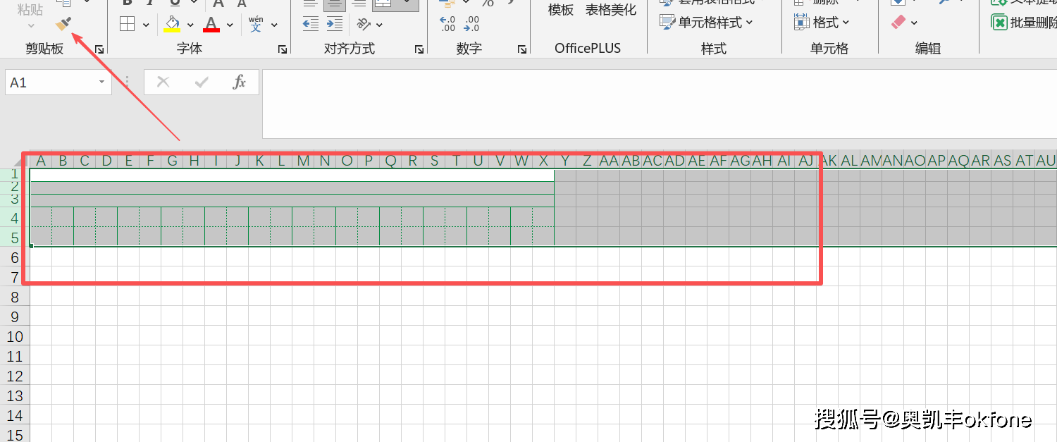 第七步:设置好的单元格,用鼠标填充到其他单元格,然后我们选择这5行,点击【格式刷】,下面的行就会变成田字格啦!