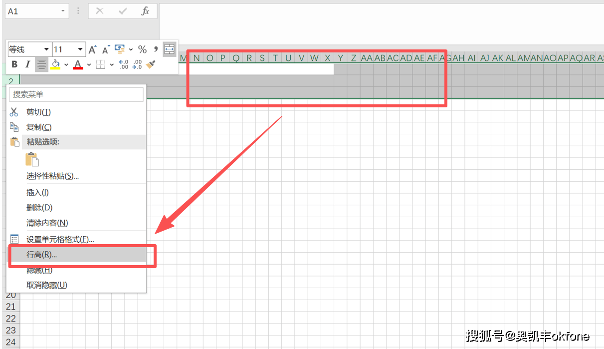 第四步:选中三行单元格,鼠标右键,选择【行高】将数值设置为9。