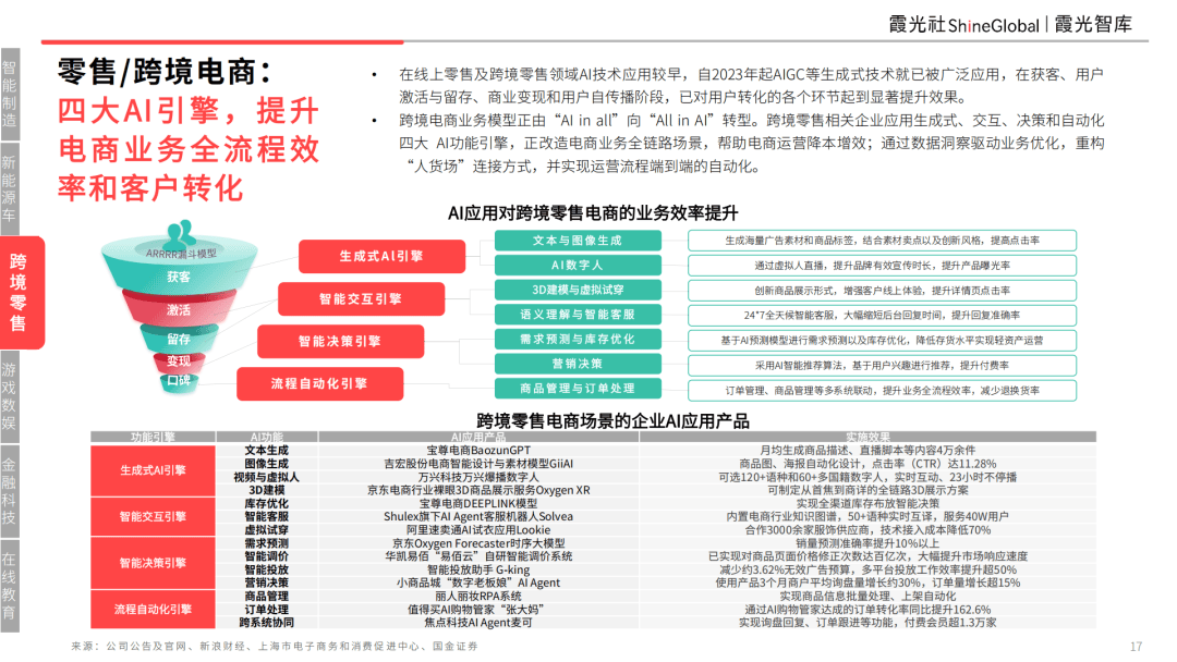在线上零售及跨境零售领域AI技术应用较早,自2023年起AIGC等生成式技术就已被广泛应用,在获客、用户激活与留存、商业变现和用户自传播阶段,已对用户转化的各个环节起到显著提升效果。