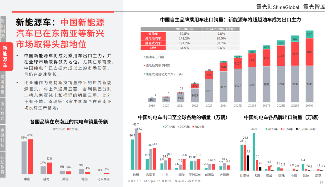 中国新能源车将成为乘用车出口主力,并在全球市场取得领先地位,尤其在东南亚,中国纯电车已占据六成以上的市场份额,且仍在高速增长。
