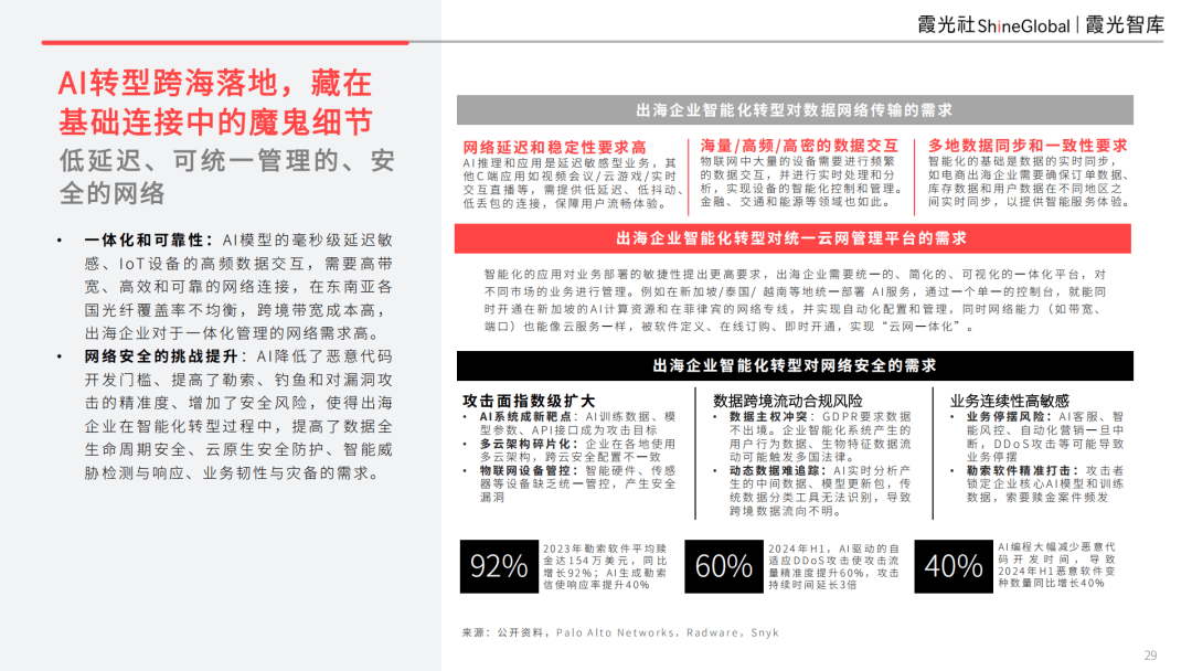AI降低了恶意代码开发门槛、提高了勒索、钓鱼和对漏洞攻击的精准度、增加了安全风险,使得出海企业在智能化转型过程中,提高了数据全生命周期安全、云原生安全防护、智能威胁检测与响应、业务韧性与灾备的需求。