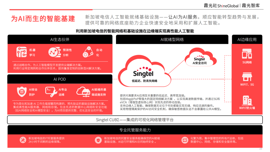 Singtel CUBΣ是智能驱动的关键连接解决方案,结合 5G、AI、Cloud与安全融合的智能网络,提供全局可视化、自动化运营与低延迟边缘 AI 执行环境,让 AI 应用从云到端都能可靠落地。