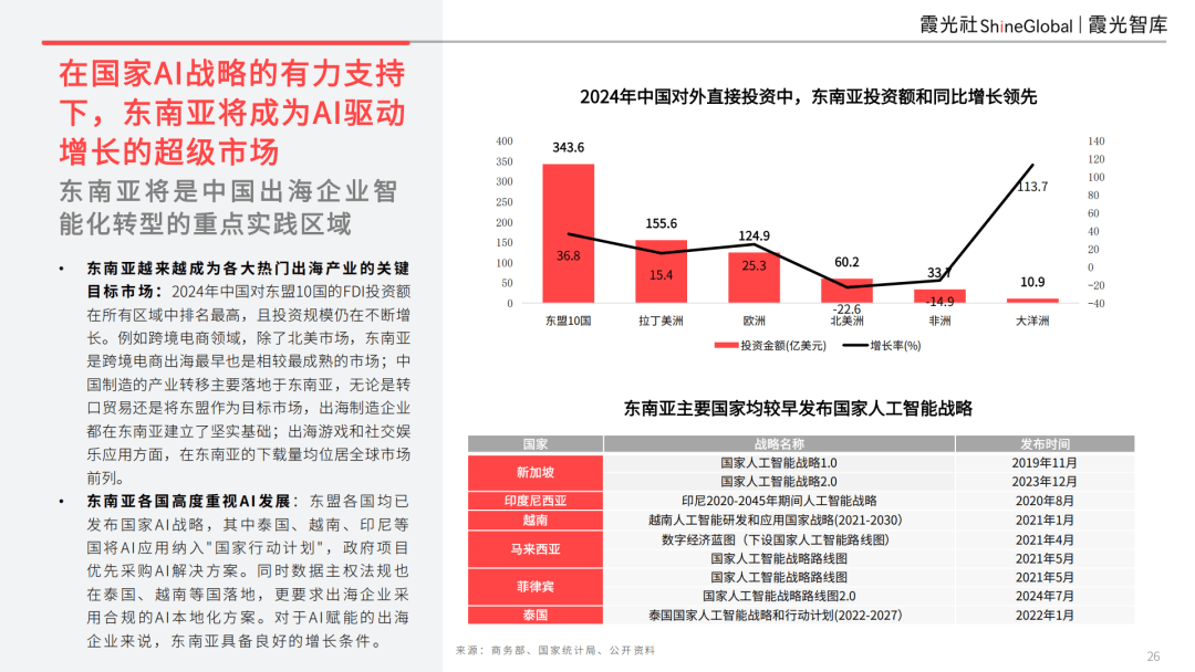 东盟各国均已发布国家AI战略,其中泰国、越南、印尼等国将AI应用纳入"国家行动计划",政府项目优先采购AI解决方案。同时数据主权法规也在泰国、越南等国落地,更要求出海企业采用合规的AI本地化方案。对于AI赋能的出海企业来说,东南亚具备良好的增长条件。