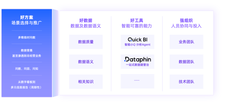 瓴羊基于与上百家头部企业的合作经验,发现数据分析Agent项目成功落地需具备四大特征:场景选择需与用户价值期待对齐并循序推广;数据准备是准确性与深度的基石;工具选择需要找到稳定可靠的企业级方案;组织上必须实现业务、数据与技术团队的深度协同。