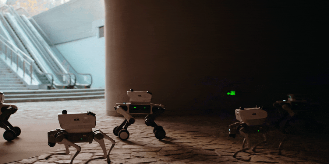 △出发执行任务的四足狗“汪汪队”,来自不同本体品牌,背上统一搭载大晓具身超级大脑模组A1,图源:企业提供