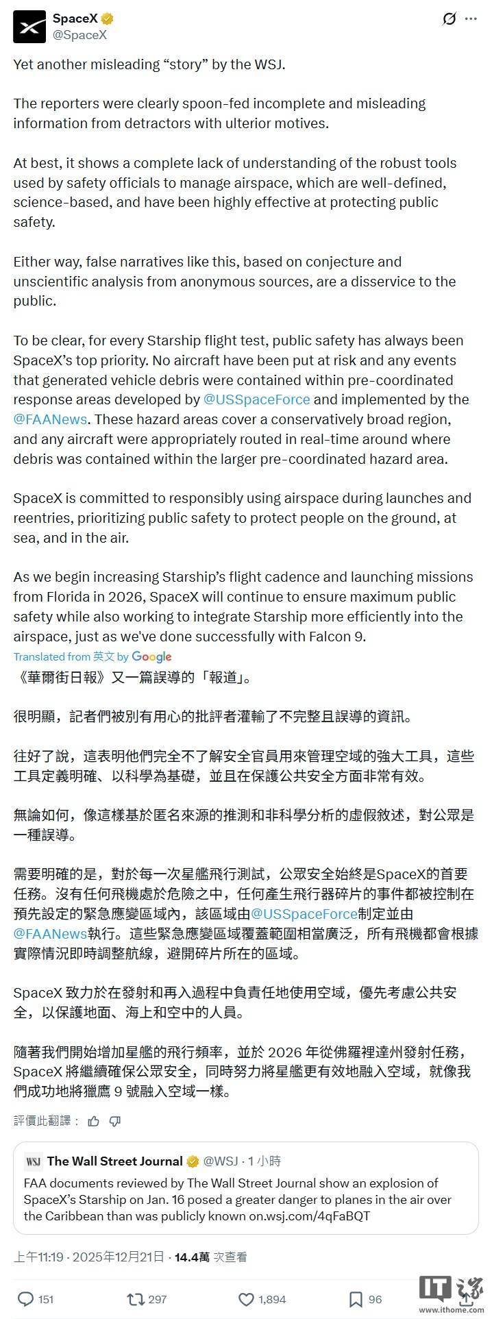 IT之家 12 月 21 日消息,SpaceX 官方今天在 X 平台发表声明,回应华尔街日报关于“星舰飞船 1 月爆炸事件危及航班安全”的报道。