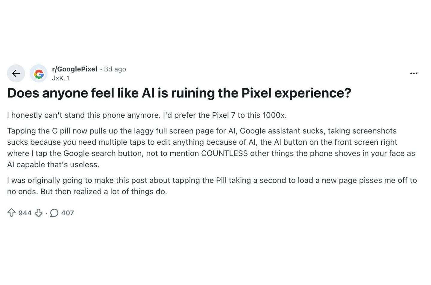 其中 Reddit 用户 JxK_1 发帖吐槽道,谷歌强加 AI 功能让系统增加了许多完全没必要的复杂层级,他甚至表示,比起新机,他更愿意用原本的 Pixel 7,至少旧手机没有那么多 AI 功能,还算能忍。