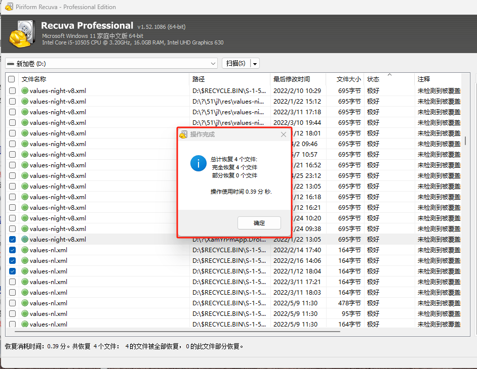 我扫描了电脑上的1.5T的D盘,大概花了12分钟,如图所示恢复这4个文件。