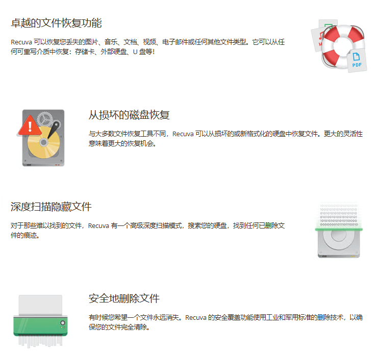 Recuva是一款操作简单、界面简洁的数据恢复软件,,无论格式化还是删除均可直接恢复,支持 FAT12,FAT16,FAT32,NTFS,exFat 文件系统。Recuva可以把你误删的文件找回来,选择好要扫描的驱动器后点击扫描按钮即可。菜鸟级别的工具,但是性能却非常的好,大部分重要文件都可以轻松恢复,速度也很快。学生、工作中有时候难免会失误的把u盘、移动硬盘、电脑硬盘等电子存储介质误删除文件,十分捉急,不用怕!第一步不要格式化存储介质,大概率通过数据恢复工具能够恢复如初。赶快试试吧!