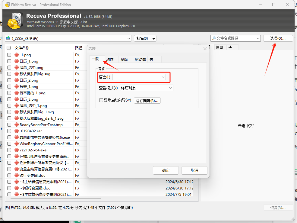 提醒:如果你需要安装的话,需要输入激活码,上面已经提供了Recuva激活密钥.txt,默认是英文的,需要设置一下中文。