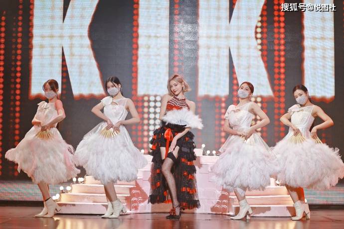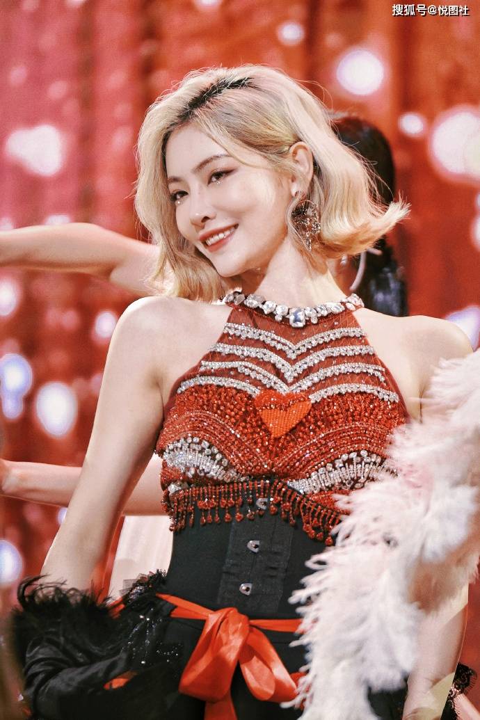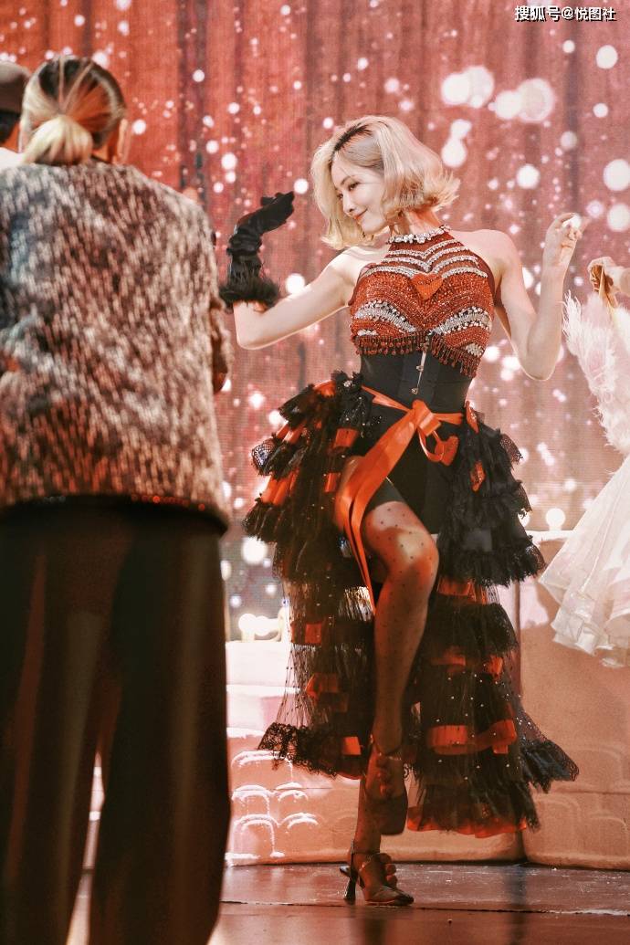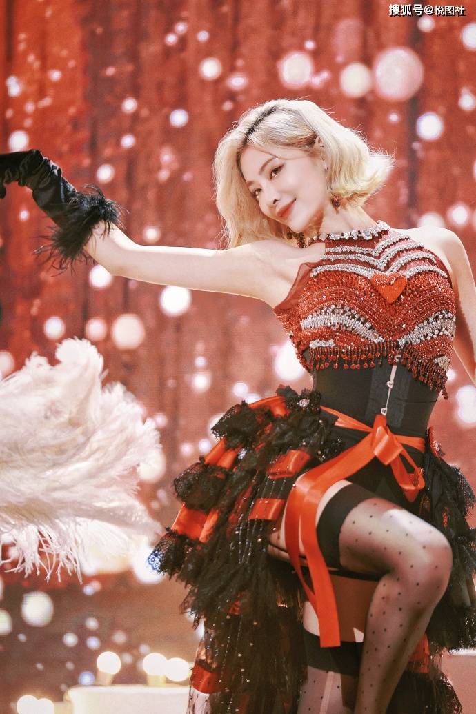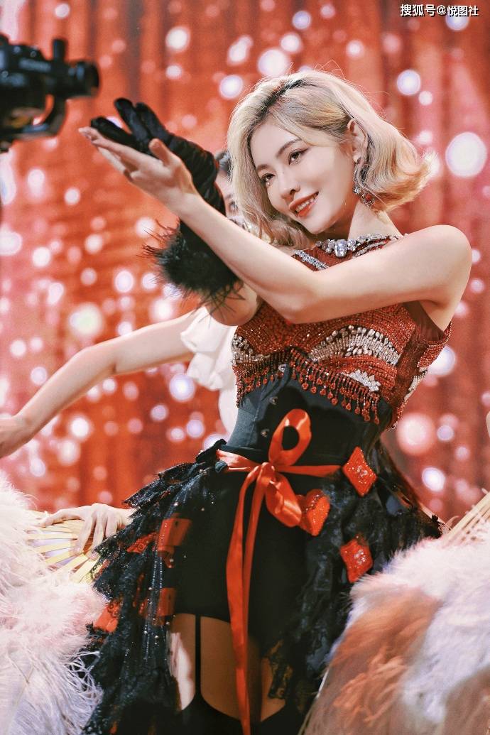 许佳琪这身红黑造型把 “甜” 与 “飒” 揉得又娇又野 —— 红钻缀满的挂脖上衣裹着心形细节,黑纱层叠的裙摆撞着红缎带,羽毛手套与波点丝袜添了复古张力;浅金发配笑眼是甜,抬臂扭腰的舞台姿态是飒。