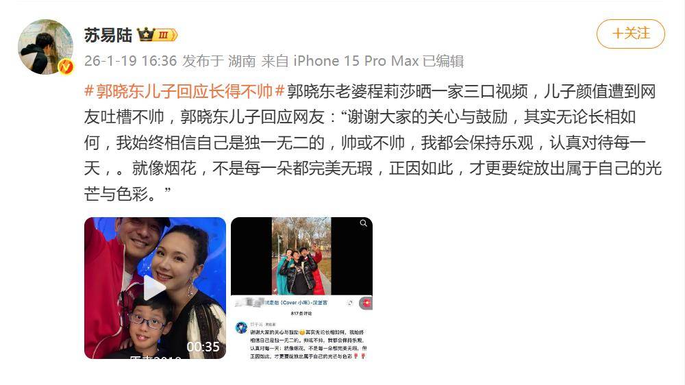 母亲程莉莎第一时间转发力挺,言语间满是骄傲与欣慰:“我还担心评论会影响你,没想到这样回复!加油儿子!你是我最大的骄傲!” 事实上,郭晓东夫妇一直以来对儿子的教育都强调内在修养与自信建立,家庭互动中充满了尊重与鼓励,这也为郭子诚面对外界声音时提供了坚实的情感后盾。