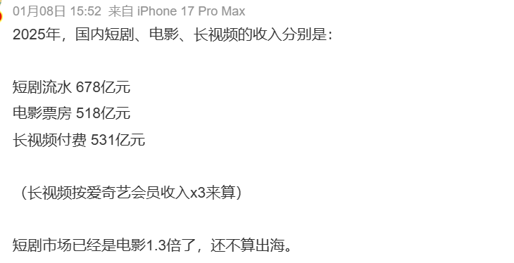 更不用说现在短剧本身已经单开一桌,总票房超越电影与长剧成绩。
