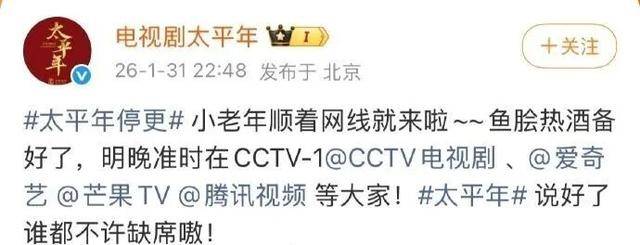 1月31日晚,#太平年停更# 登上微博热搜,随后 @电视剧太平年 发博回应:小老年顺着网线就来啦~~鱼脍热酒备好了,2月1日晚准时在CCTV-1@CCTV电视剧、@爱奇艺@芒果TV @腾讯视频等着大家,说好了都不许缺席嗷。