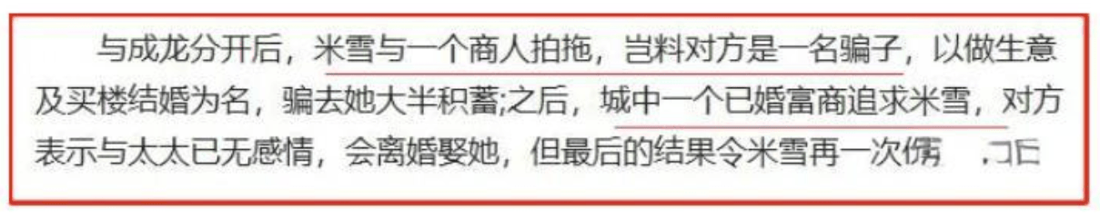 不仅如此,两人似乎连一个正式的分手都没有:成龙移情别恋的消息,还是米雪从朋友口中和报纸上得知的。