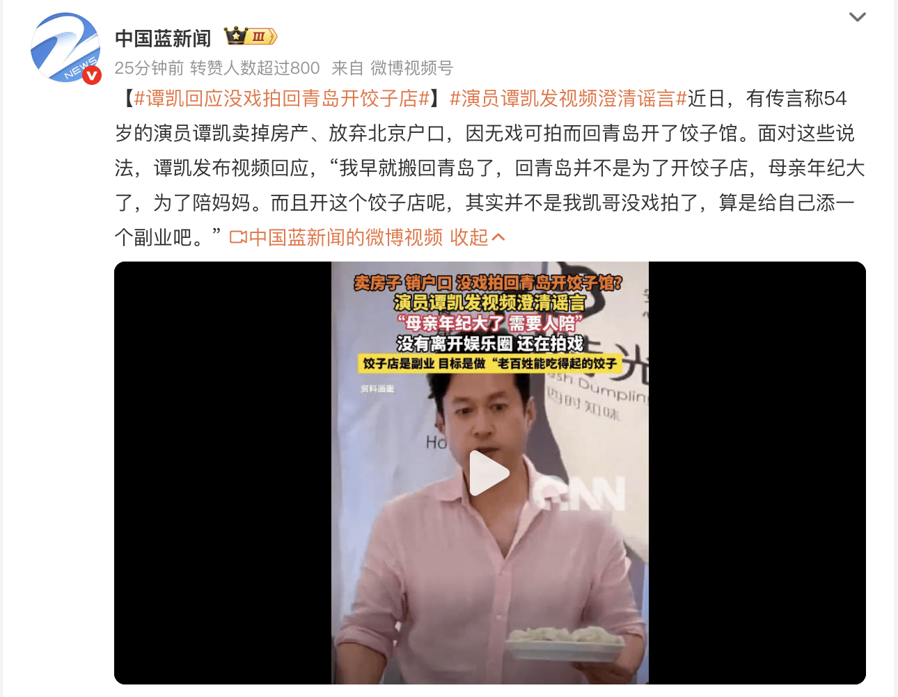 网上传的版本有模有样,说谭凯混到无戏可拍,只能卖掉北京房产、放弃户口,回老家靠开饺子馆谋生。不少网友都信以为真,还替这位实力派演员惋惜,觉得中年演员太不容易。