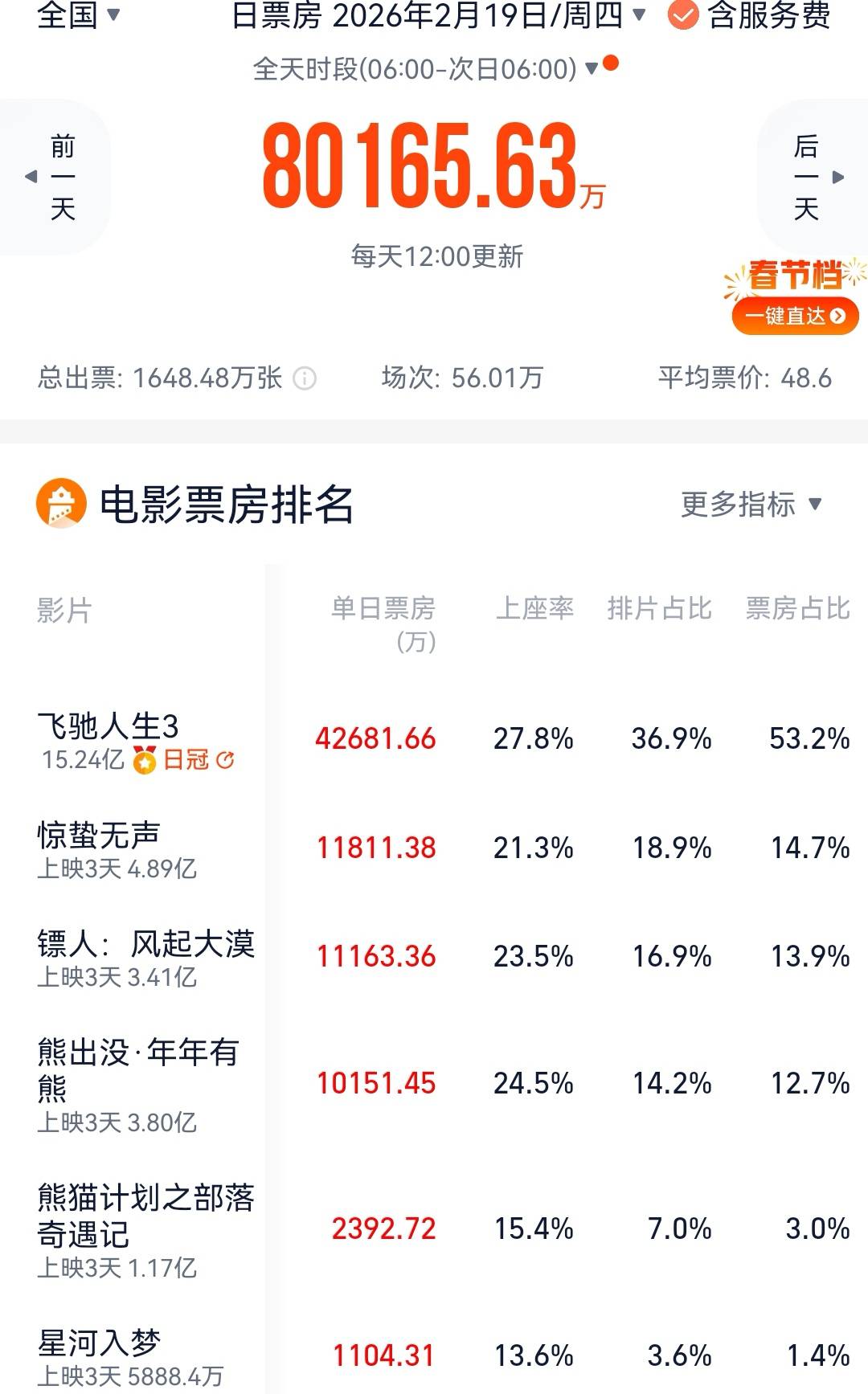 武侠片《镖人》口碑不错,豆瓣评分7.5分,日票房开始反弹,初三票房1.12亿元,较初二的9845万元不降反升,初三票房反超了《熊出没·年年有熊》,追近《惊蛰无声》,站到了第三的位置,上座率高过《惊蛰无声》,猫眼专业版预测其最终总票房11亿元,灯塔专业版的预测是13亿元。