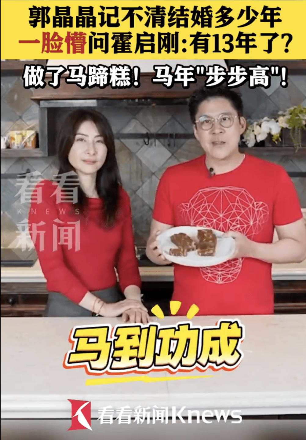 2月19日,郭晶晶更新社交动态,和霍启刚在厨房做马蹄糕给网友拜年,画面温馨又接地气。霍启刚随口一句“结婚13年了”,郭晶晶瞬间瞪圆眼睛,一脸不可置信地反问“13年了吗?”,这没剧本的真实反应,直接戳中全网。