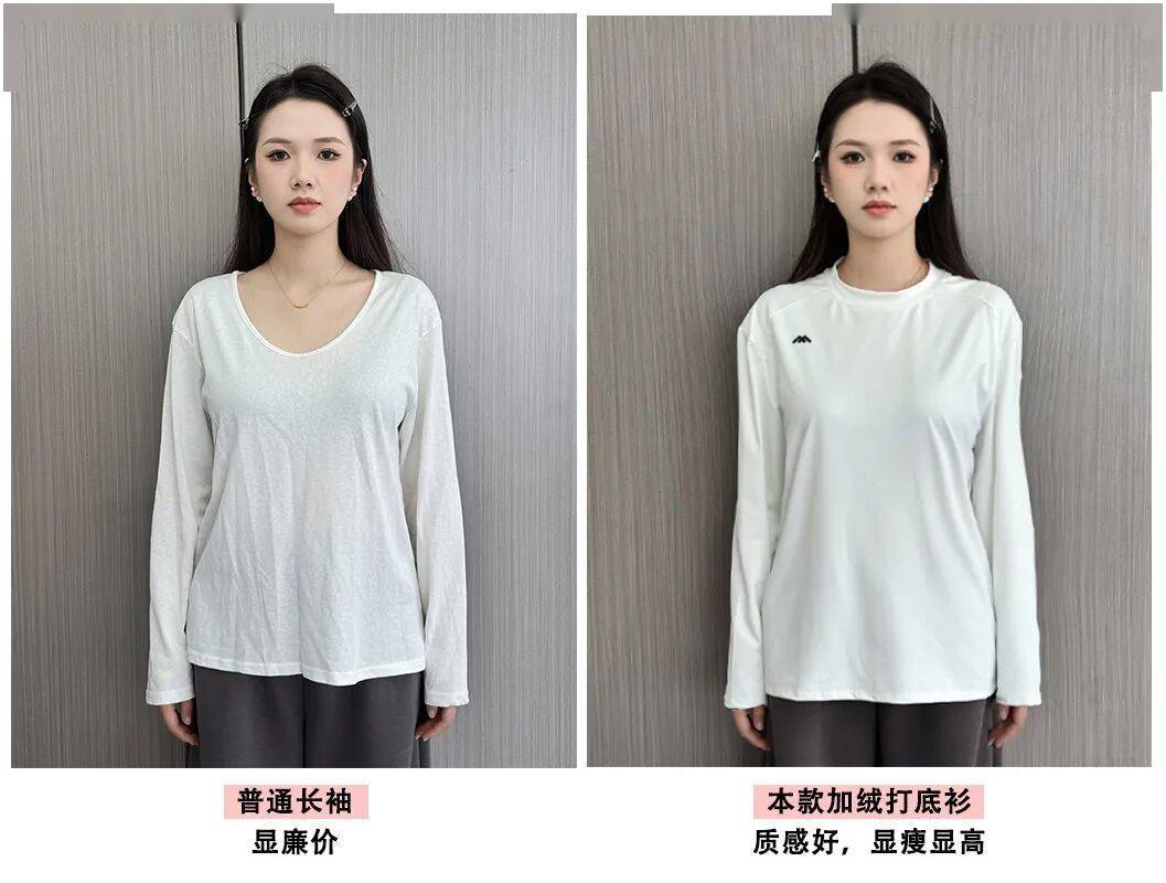 对比普通宽松长袖一塌一团,像家居服;这件加绒打底衫不塌、不鼓、不显臃肿。
