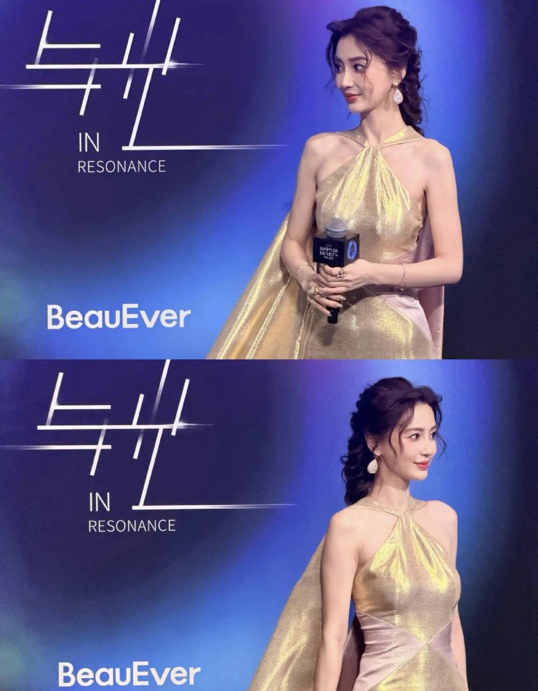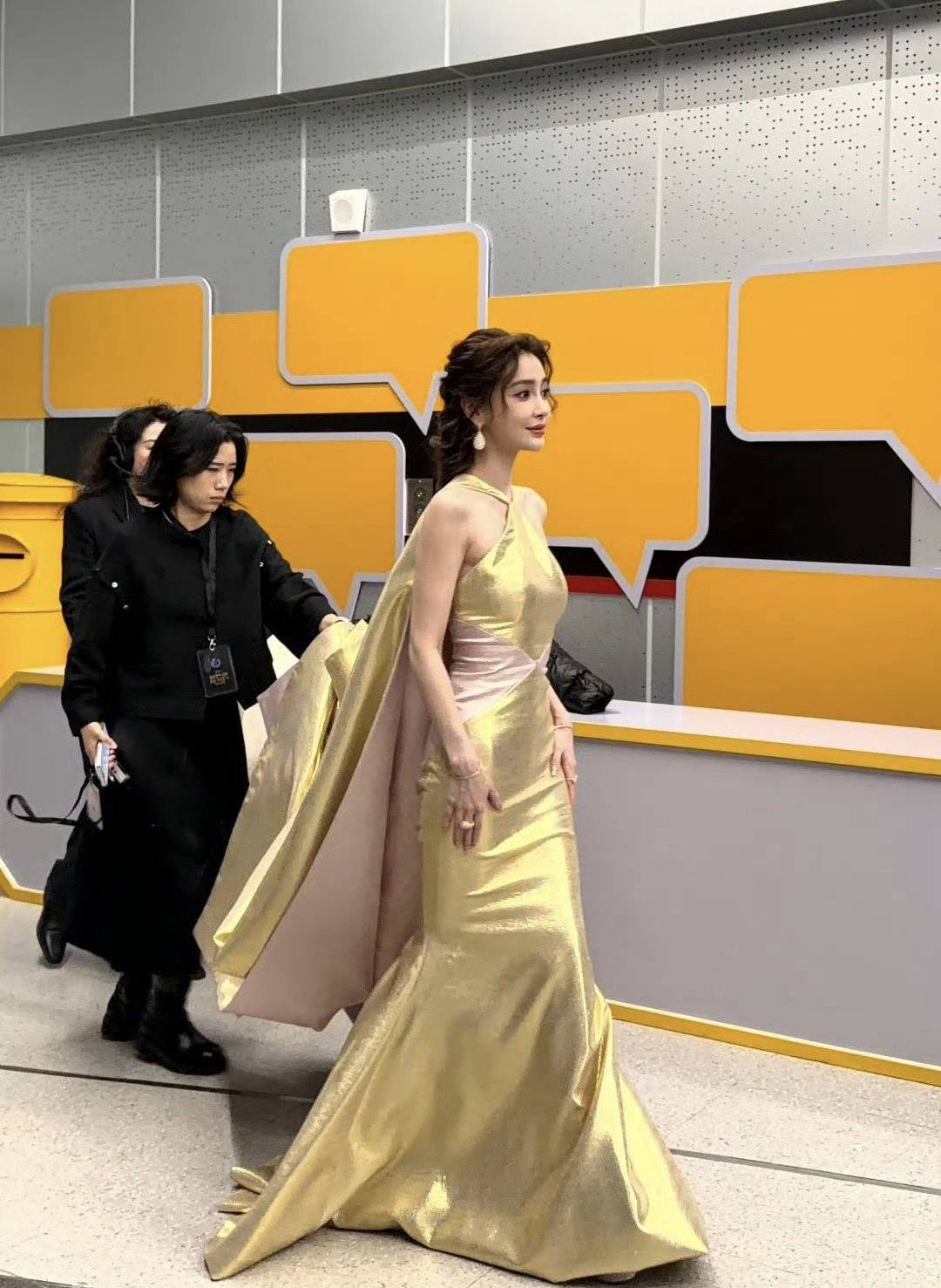 当晚,她身穿Alexis Mabille 2024秋冬鎏金高定长裙,挂脖设计完美勾勒出标志性的直角肩与精致锁骨,裙身由金银丝织物与亮片交织而成,在灯光下泛起如香槟泡沫般流动的光泽。搭配Boucheron高级珠宝与微卷麻花辫造型,整体气场雍容华贵,被网友誉为“女皇归来”。