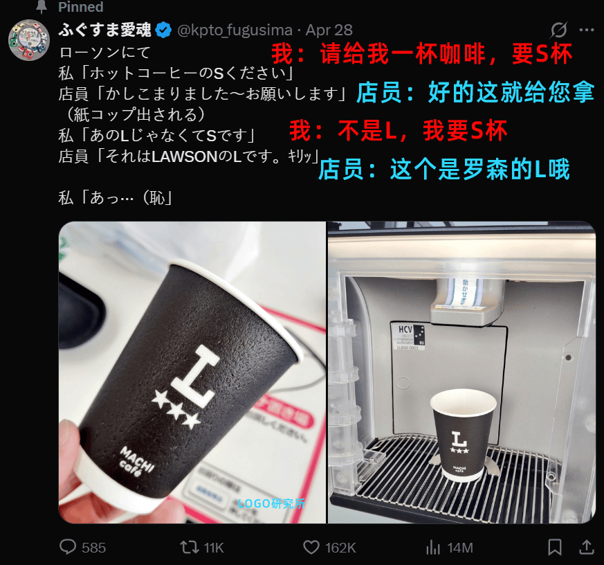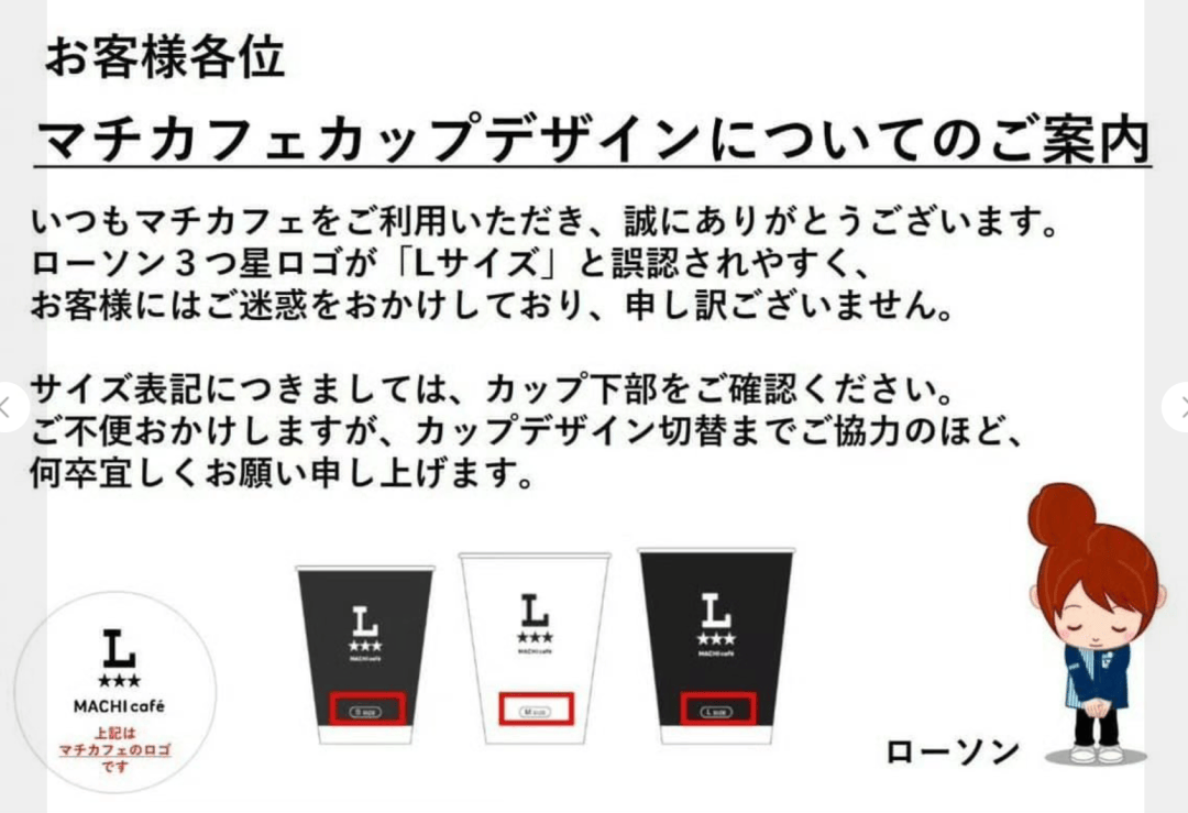 餐饮行业里L号通常代表大杯,M代表中杯,S代表小杯,罗森的一个大大的L容易让人消费者产生疑问,到底是LOGO还是杯号?
