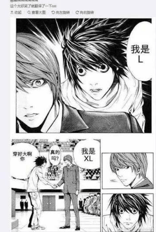 联想到了国内已经被禁的漫画《死亡笔记》,男主的名字叫L,结果被网友恶搞成衣服号,反派名字是夜神月,被改成了衣号是XL。