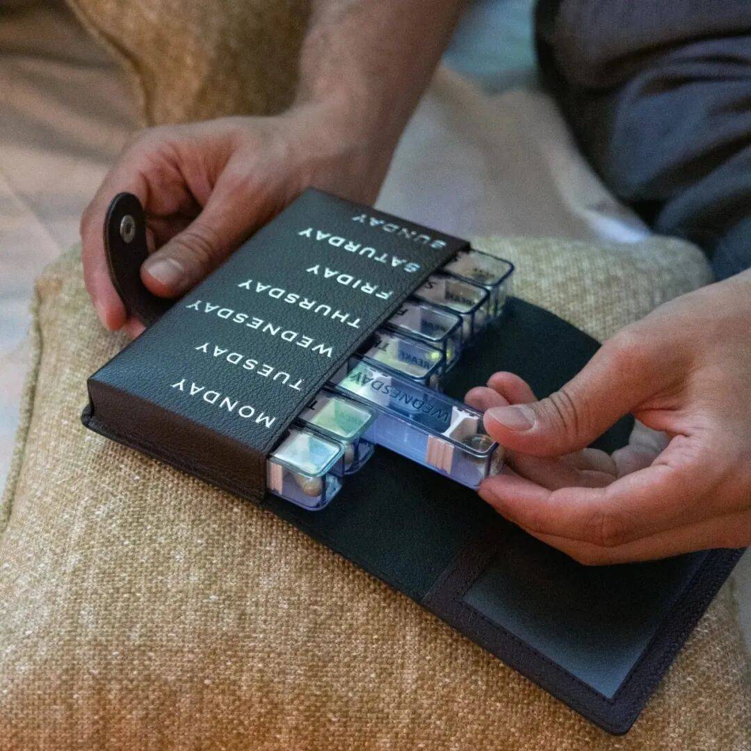 比如主打药品与保健品收纳的 Capra Pill Case 药盒包,甄选手工山羊皮制成,分设七天独立收纳格,可按需灵活使用。