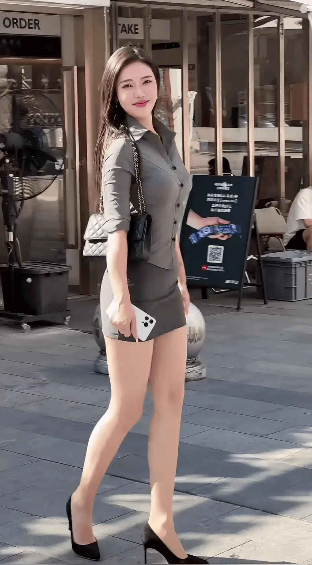 灰色的衬衫搭配同色系的包臀裙和黑色高跟鞋,展现出了职场干练利落的气质,令双腿显得非常修长匀称,气场十足,魅力四射!