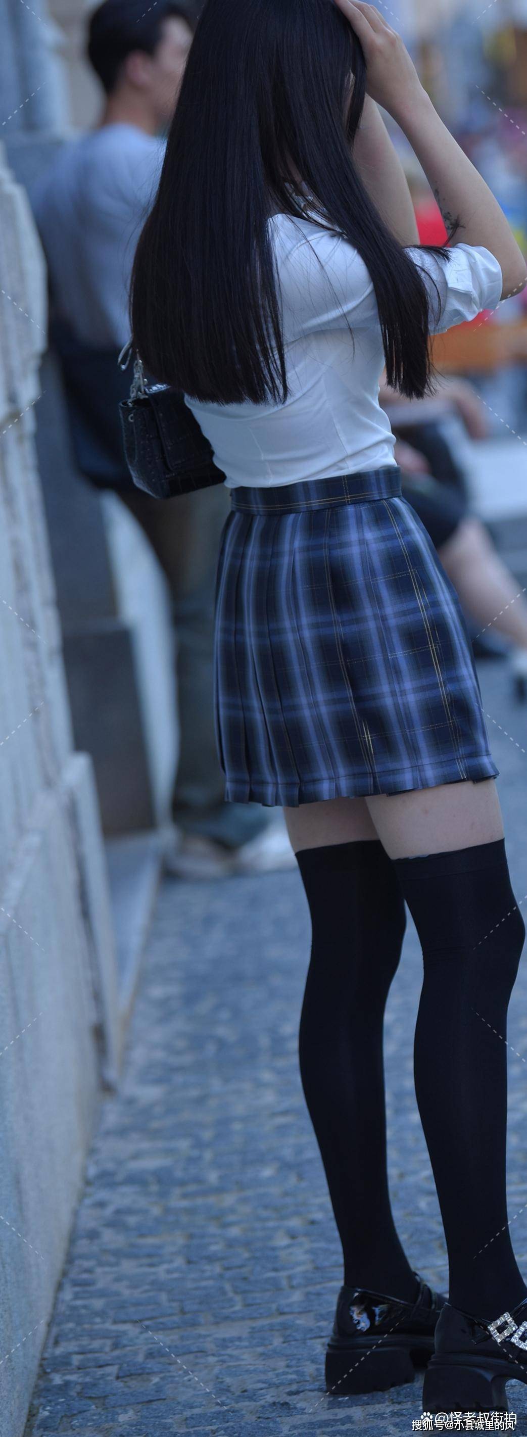 3. 鞋袜组合:黑色过膝长袜搭配黑色厚底玛丽珍鞋,过膝袜修饰腿部线条,同时强化了学院风氛围;厚底玛丽珍鞋自带复古甜酷感,与格纹裙呼应的同时,也让整体造型更具立体感。