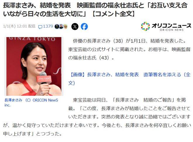 2026年1月1日,日本的国民女神长泽雅美宣布结婚的消息引发了震动。这位38岁的女演员通过东宝艺能官网发布了一份声明,宣布她与43岁的电影导演福永壮志已正式登记结婚。她在声明中向支持她的粉丝们表示歉意,因为这件私人事情占用了大家的时间。长泽雅美说:今后我们会彼此扶持,珍惜每一天的生活,一步步走好接下来的路。虽然我们还很不成熟,但如果大家能继续温暖地关注我们,我将非常感激。