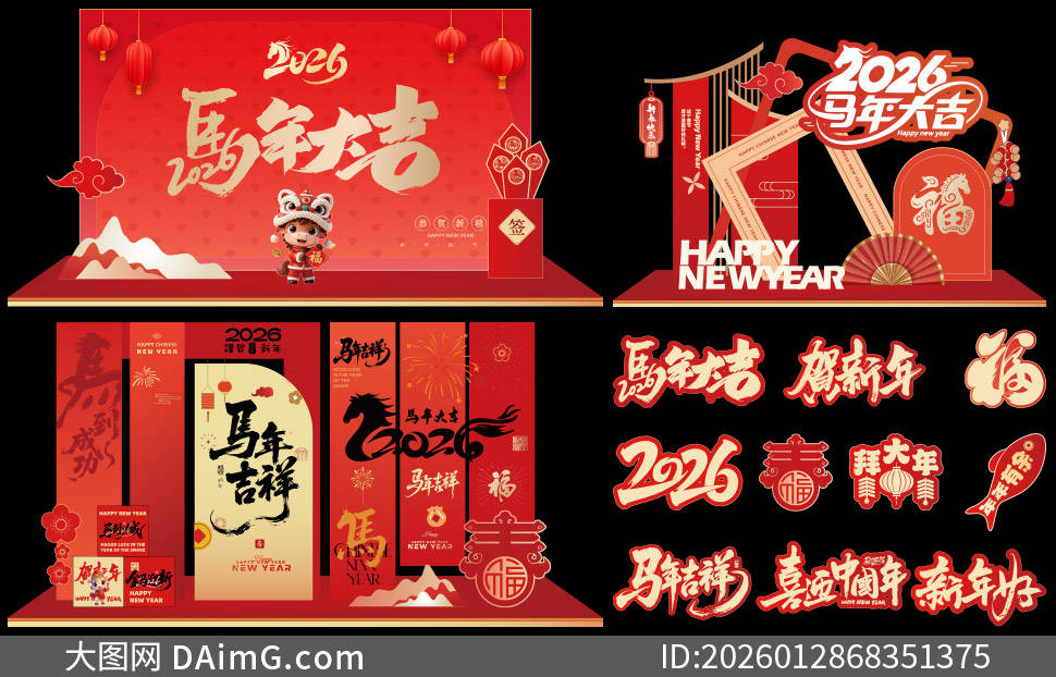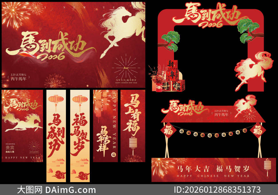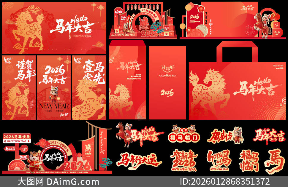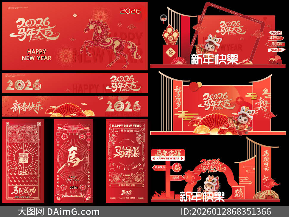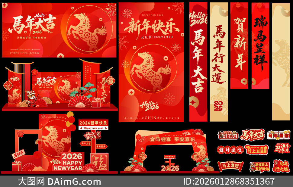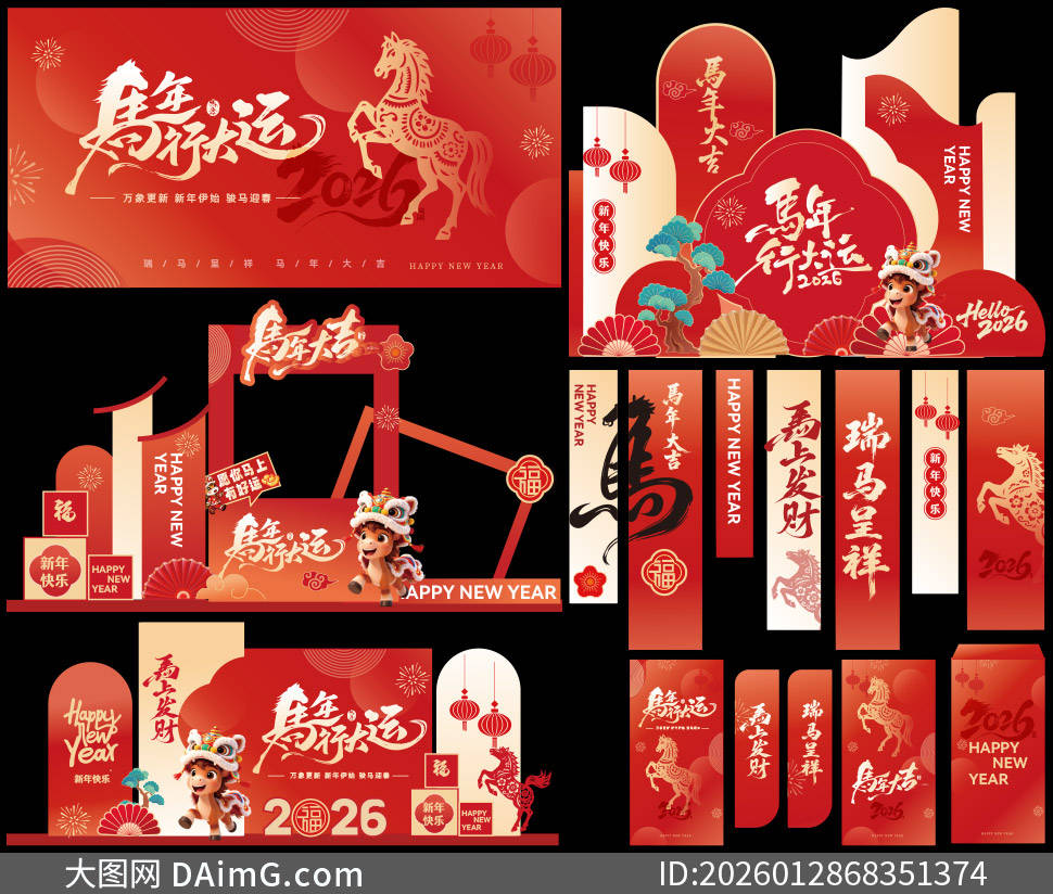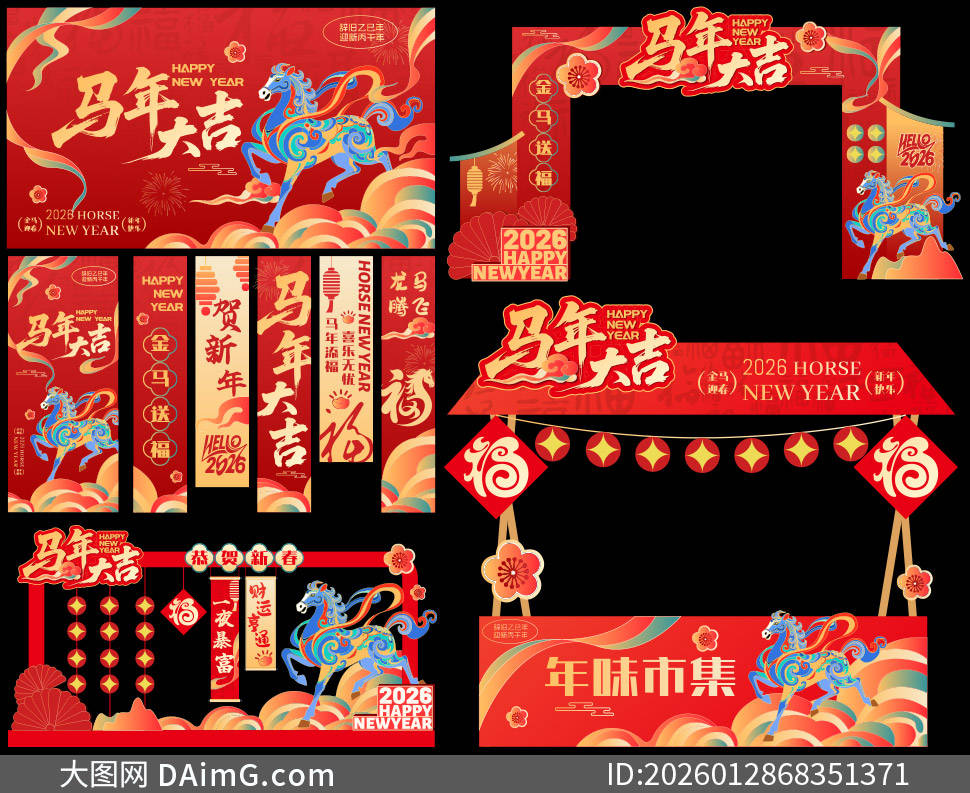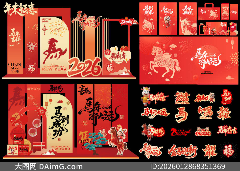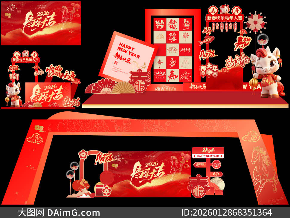 今天来给大家分享一组超有创意的2026马年商场美陈布置设计模板。踏入商场,首先映入眼帘的是以金色骏马为主体的大型拱门,骏马昂首扬蹄,仿佛正奔腾向前,寓意着新的一年一马当先、勇往直前,拱门上还点缀着红色绸带与金色铃铛,增添了喜庆氛围。