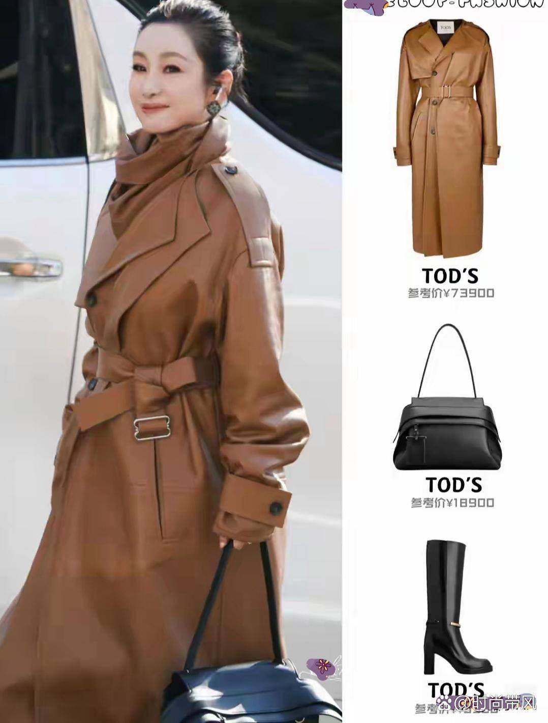 秦海璐穿着这件咖色皮大衣,搭配同色系的围巾,自信优雅,有一种极具存在感的奢华腔调。