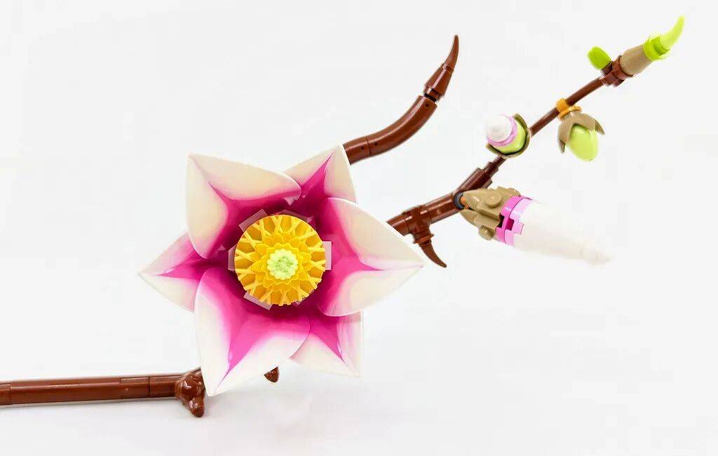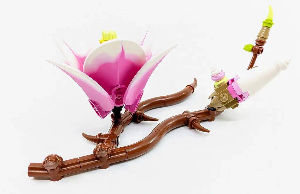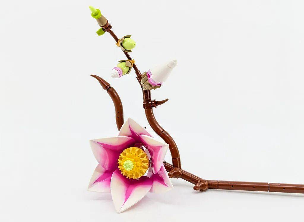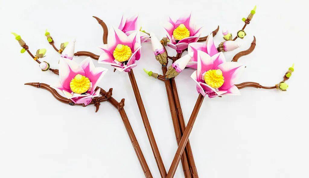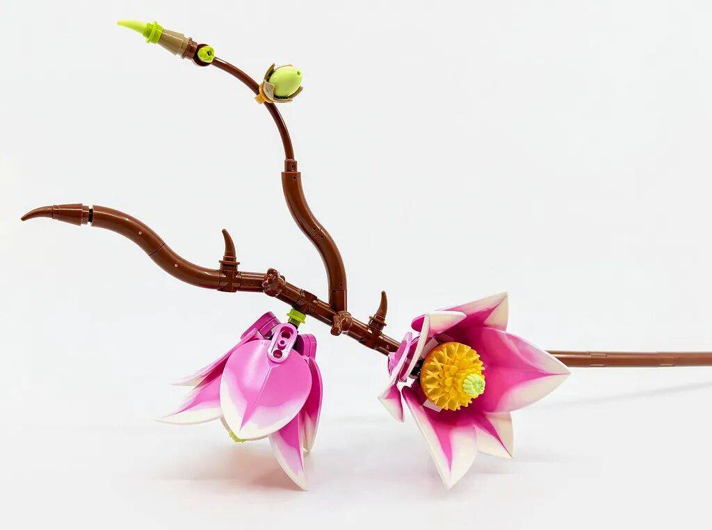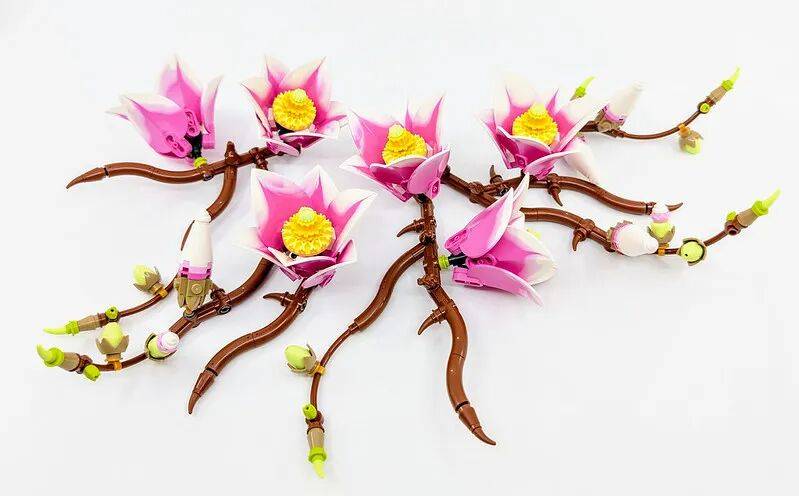 结构与组成:多款新零件亮眼套装一共包含 5 根独立枝条,每根在花朵数量和布局上都有区别。总共搭配了 6 朵盛开的木兰,以及若干花苞和球果,让整体看起来层次更丰富。