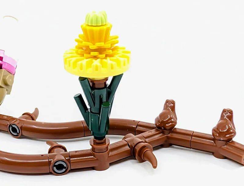 枝条节点处用棕色青蛙零件点缀,打破了直线的呆板,增添自然生长的起伏感。花心醒目的黄色花蕊,是由新配色的轮毂零件和纸杯蛋糕零件组合而成,颜色鲜明、辨识度高。