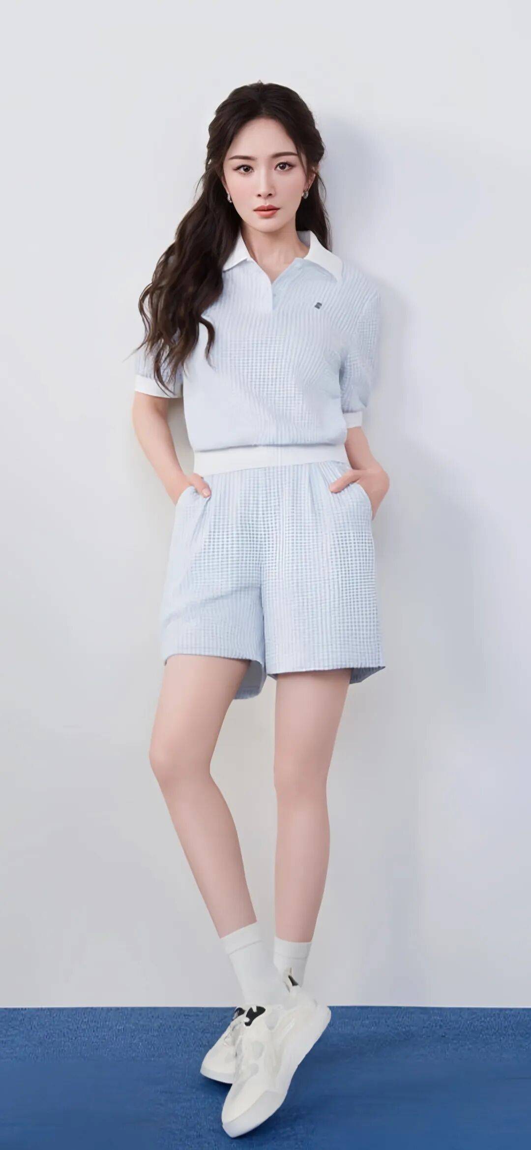 杨幂这组蓝白套装写真也太会了吧!简单的浅蓝色格纹Polo衫配同色系短裤,居然被她穿出了大牌高定的感觉。衣服上的竖条纹纹理在阳光下若隐若现,领口和袖口的白色包边像给天空镶了道白云边,清爽得像刚从冰箱里拿出来的柠檬汽水。