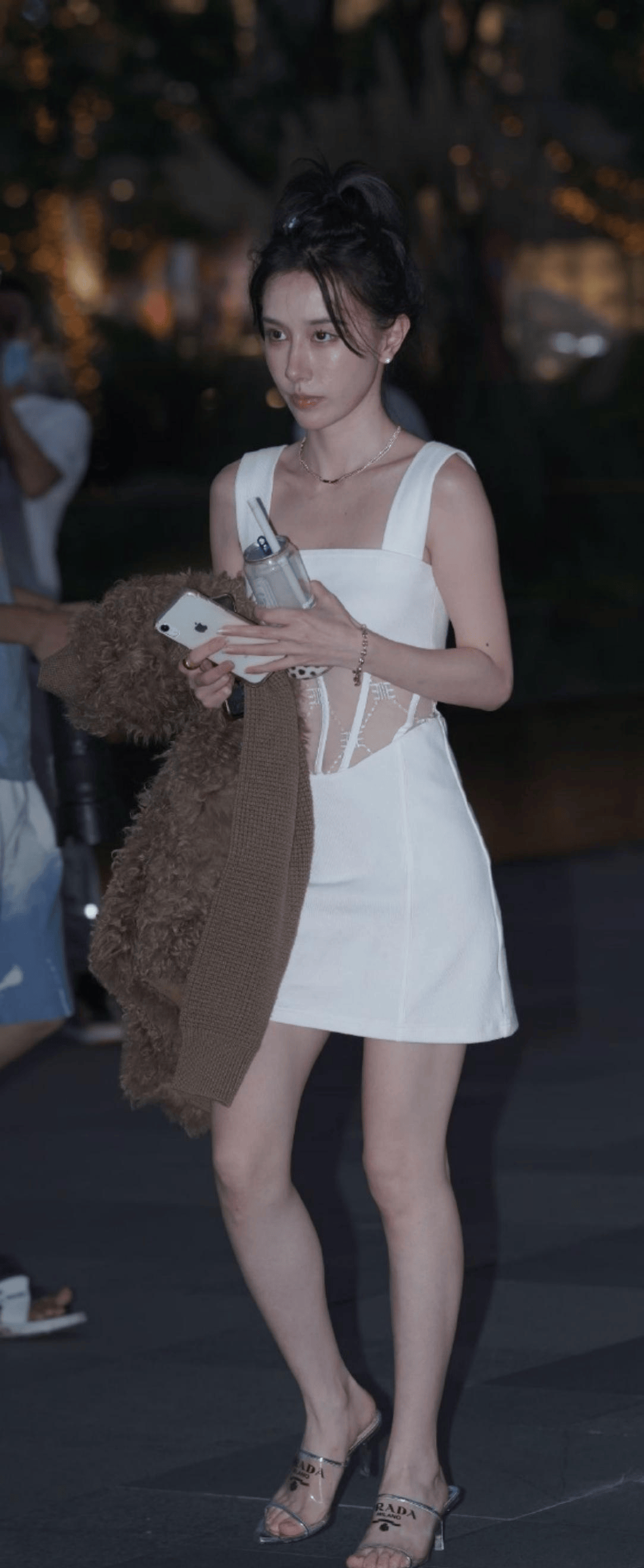 纤细的四肢在裙装的衬托下更显修长,笔直的双腿从短款的裙摆下露出,皮肤白皙细腻,像上好的羊脂玉,每一步都带着轻盈的韵律,仿佛踩在自己的节奏里。宽肩带的设计恰好修饰了肩颈线条,让身形显得愈发挺拔,行走时的姿态舒展又自信,没有刻意的扭捏,只有浑然天成的优雅,在街头的风里,像一株舒展的植物,自在又鲜活。