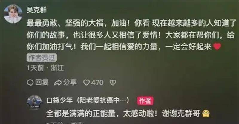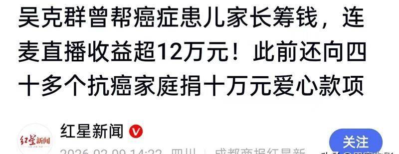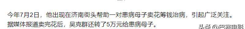 去年7月份,吴克群在街头帮癌症患儿的母亲卖花,后来又转了5万块给对方;到10月份,他还为一位癌症女孩安排了婚礼,提供了一些经济上的援助,还在评论区为这对新婚小夫妻送上祝福和鼓励。