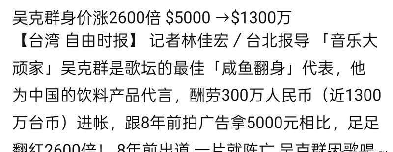 吴克群一跃成为歌坛新秀,不再是那个身上只剩7块钱、欠着16个月房租的穷小子了。