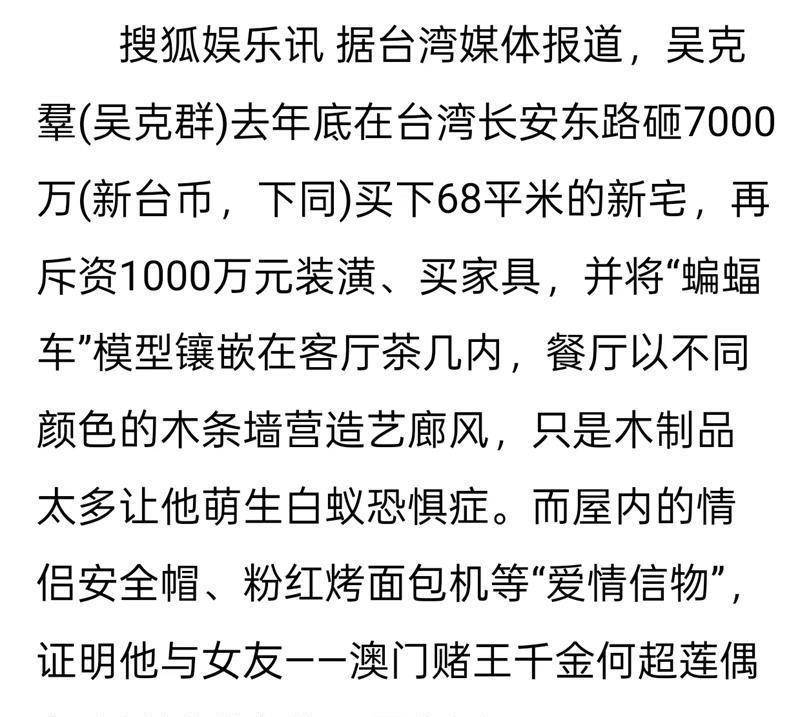 据台媒透露,为了营造和女友的浪漫氛围,吴克群出手大方,花了7000万台币买了一套新房,还在装修上花了超过1000万。