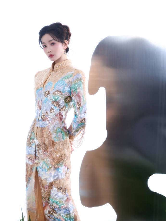 与杨幂的奢华风格不同,刘诗诗的新年贺岁造型则更具文化内涵,简约而不失浪漫。她身穿的是定制的裸色薄纱旗袍,上面用手工刺绣的《千里江山图》让整件衣服犹如一件艺术品。刺绣细腻,且极具文化底蕴,展现了她对传统文化的尊重与融汇。这款旗袍的设计非常考究,裸色薄纱如宣纸般轻盈温润,刺绣部分的精致华丽更显得分外夺目。薄纱的轻盈与刺绣的厚重形成了鲜明的对比,既保持了旗袍的古典韵味,又为其注入了现代仙气。可以说,刘诗诗在这件旗袍中的呈现,仿佛从一幅山水画中走出来的仙女,浑身散发着与众不同的气质。