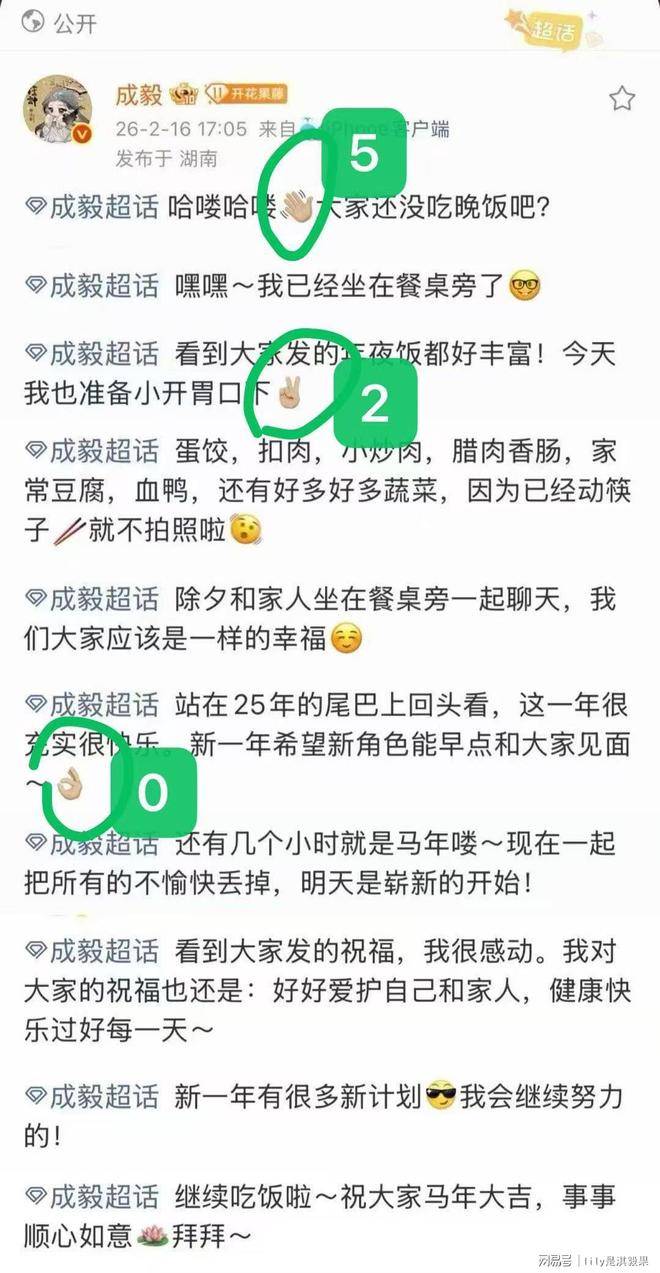 今天是除夕,灯火辉煌的夜晚充满了团聚的温暖,而我却被成毅的一份无图年夜饭深深触动,仿佛他用最平实的方式,拨动了我心底最柔软的那根弦。没有精致的摆盘,也没有滤镜的修饰,只有简单的一句温柔报备、一份家常菜单和一段与果果们亲切的闲聊,便将那最真实的烟火气与满满的诚意,注入到这个新春佳节的每一瞬间。